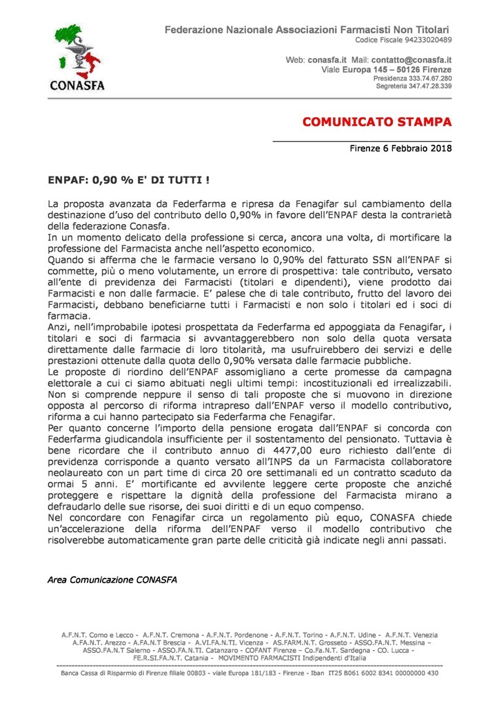 CONASFA Federazione Nazionale Associazioni Farmacisti Non Titolari COMUNICATO STAMPA Firenze 22 maggio 2015 NELL’ATTESA DELLA “RIFORMA” ENPAF Si apprende con cauto ottimismo che la problematica dell’obbligo del pagamento della quota Enpaf per i farmacisti dipendenti, sia finalmente divenuta oggetto di discussione in ambito parlamentare. Conasfa, da tempo ribadisce la necessità di un ammodernamento dell’ENPAF nella […]